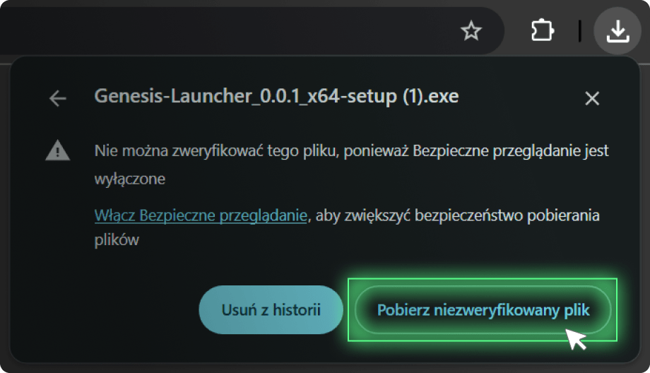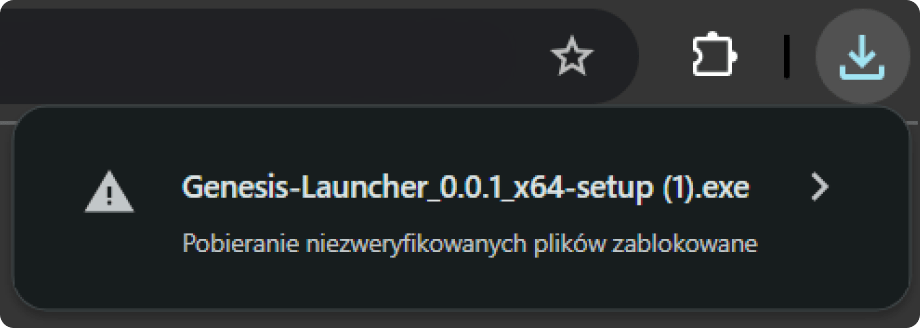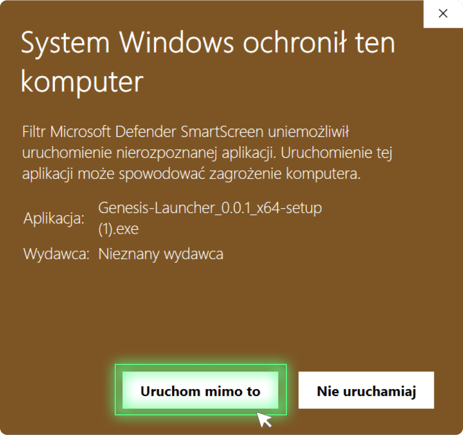 W tym miejscu, po odpaleniu “Genesis-Launcher” system może zablokować instalacje niezweryfikowanego pliku.