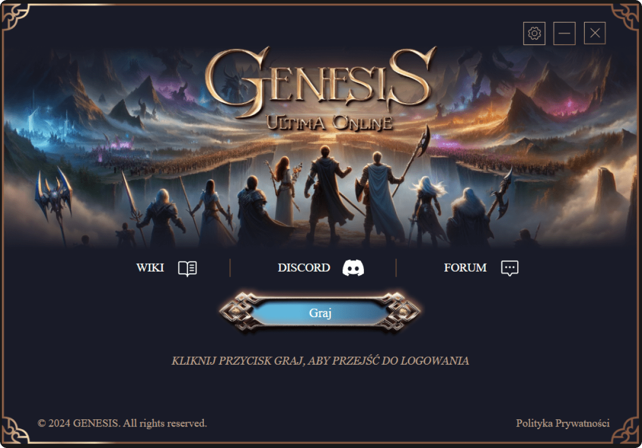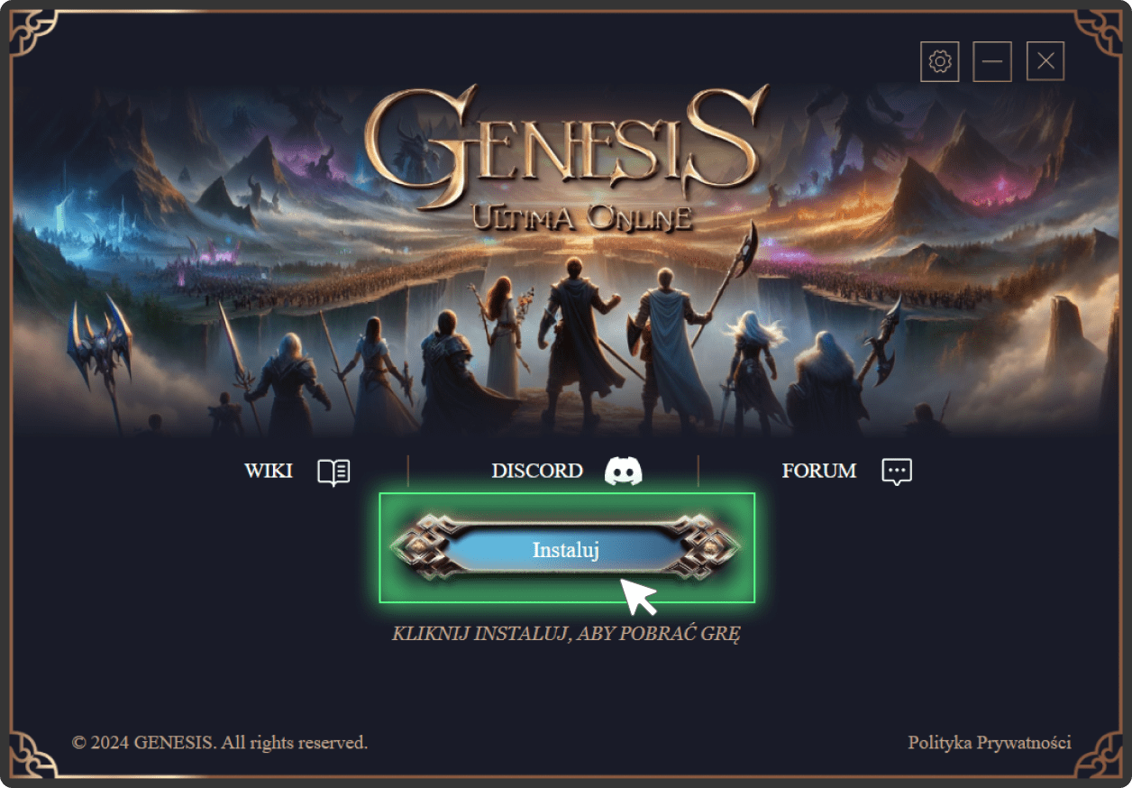 Po uruchomieniu “Genesis-Launcher” wciśnij przycisk “Instaluj” aby pobrać pliki gry Ultima Online – Genesis. ClassicUO i Razor są dołączone do instalacji i są jedynymi legalnymi opcjami klienta do rozgrywki. Całkowita instalacja ma około 1,5 GB.