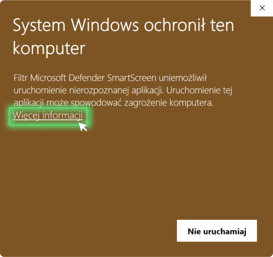 Należy najechać myszką na przycisk “Więcej informacji” i rozwinąć go, a następnie wybrać opcje “Uruchom mimo to“