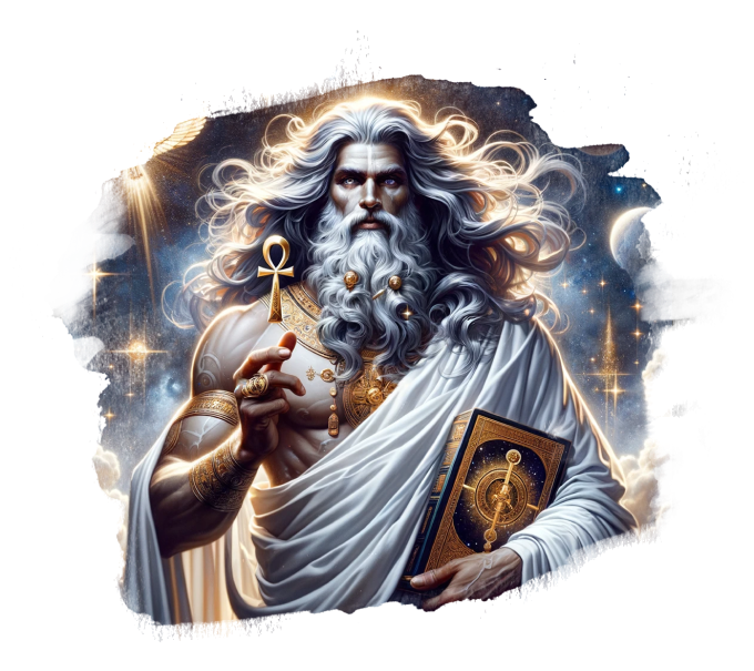 Jego skóra lśni subtelnym blaskiem białej perły, symbolizując czystość i doskonałość. Spowijają go długie, białe szaty, które zdają się płynąć wokół niego niczym esencja życia. Gładkie, złote włosy swobodnie opadają na plecy, a elegancko ułożona broda dodaje mu autorytetu.