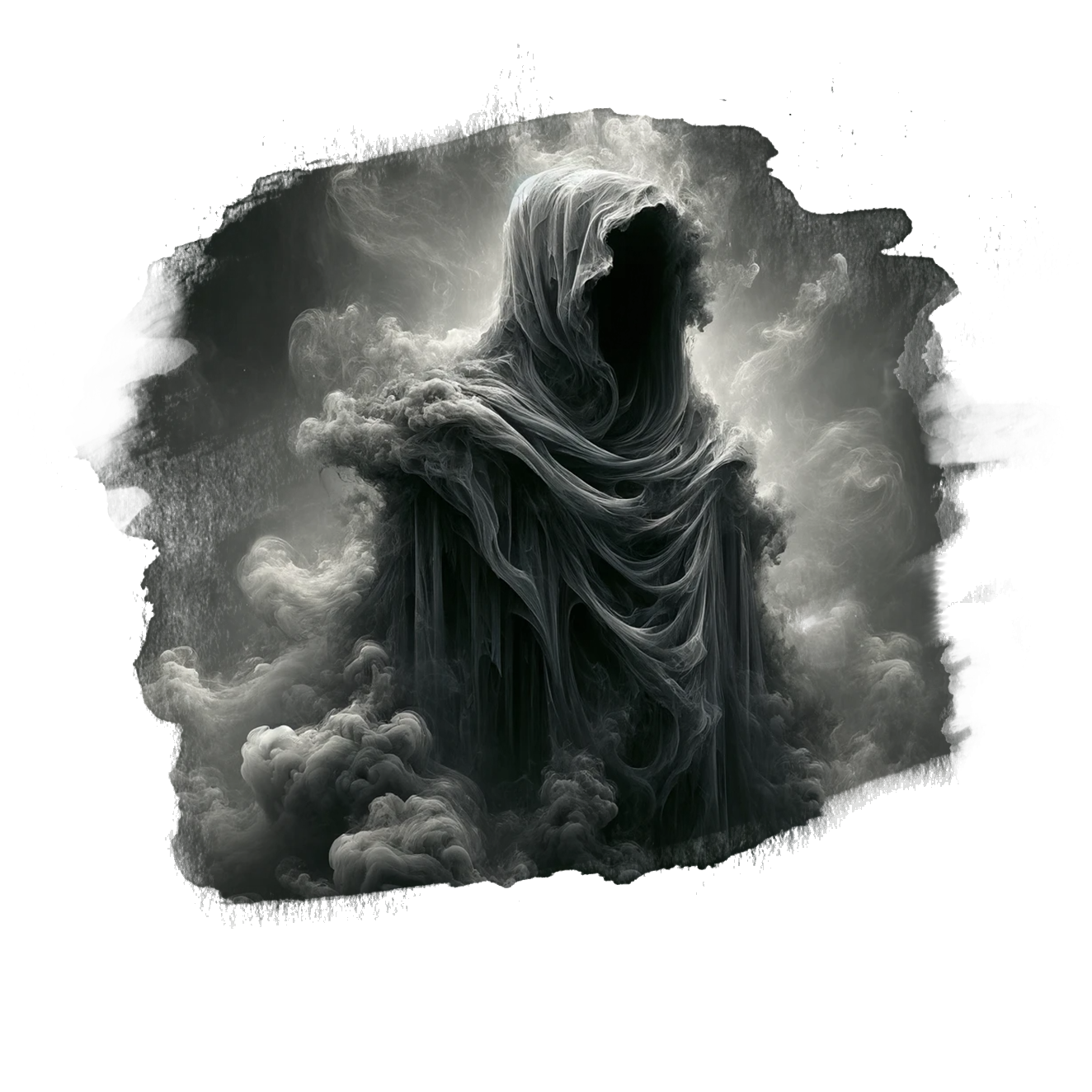 Jego ciało jest płynne, utkane z dymu i cieni, nieustannie falujące i zmieniające kształt. Nie posiada wyraźnych rysów, a jego forma zdaje się rozmywać na krawędziach, jakby nigdy nie była w pełni w tej rzeczywistości. Porusza się bezszelestnie, wtapiając się w otoczenie, jego sylwetka niknie i pojawia się w miejscach, gdzie światło i mrok splatają się w jedną całość.