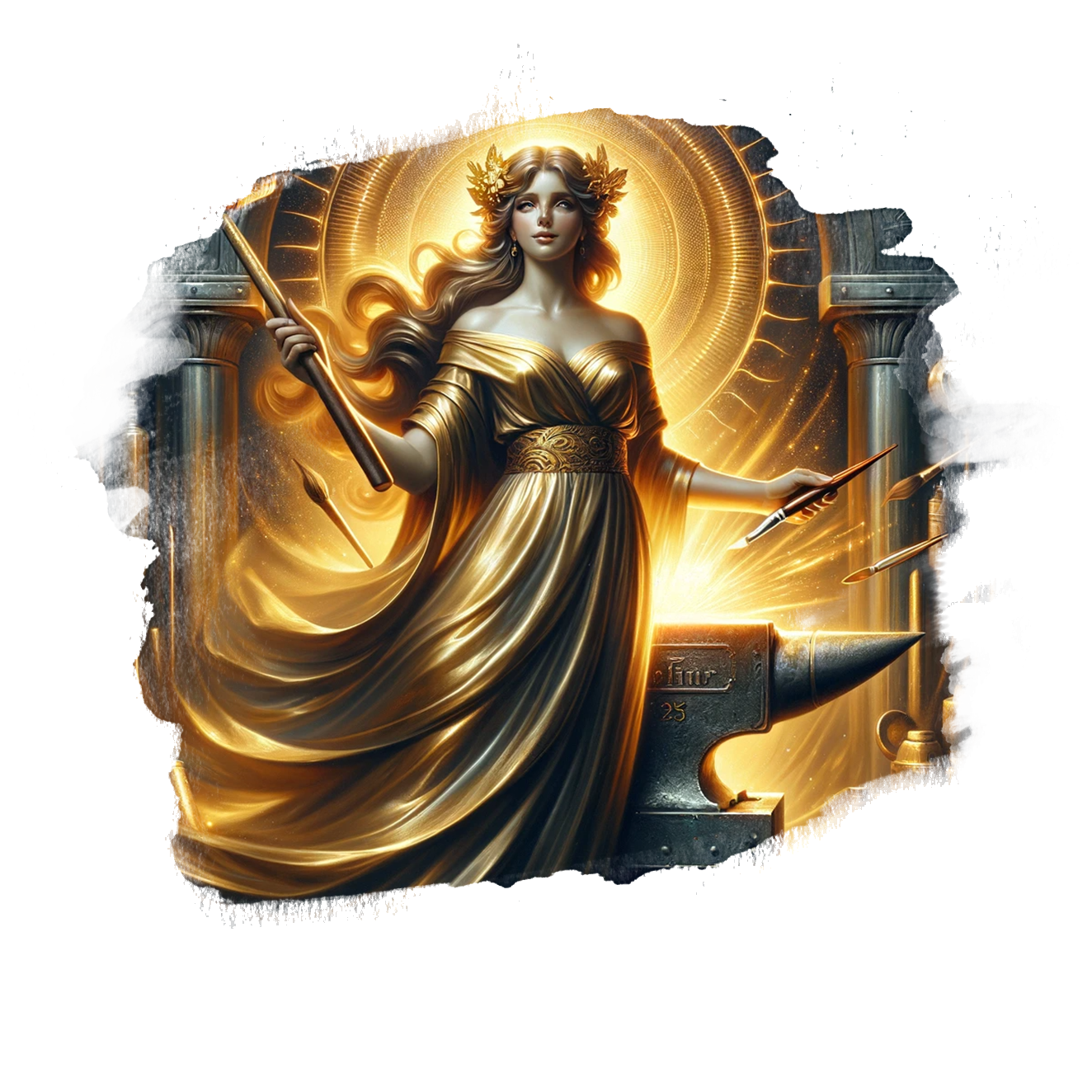 Najbardziej charakterystycznym atrybutem Valorii jest jej złoty młot kowalski. Nie jest to jedynie symbol jej mocy, lecz narzędzie, za pomocą którego kształtuje i inspiruje świat sztuki. Młot, wykonany z lśniącego złota, posiada rękojeść zdobioną misternymi wzorami i inskrypcjami, będącymi odzwierciedleniem twórczej energii. To artefakt o niezwykłej mocy, zdolny przekształcać myśli i idee w materialną formę.